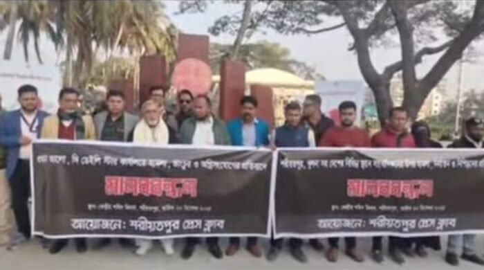 শাহাজাদী সুলতানা, বিশেষ প্রতিনিধি। শরীয়তপুরে প্রথম আলো ও ডেইলি স্টার কার্যালয়ে হামলার ঘটনার প্রতিবাদে মানববন্ধন অনুষ্ঠিত হয়েছে। সোমবার (২২ ডিসেম্বর) বিকাল তিনটার দিকে শরীয়তপুর কেন্দ্রীয় শহীদ মিনার চত্বরে শরীয়তপুর প্রেসক্লাবের