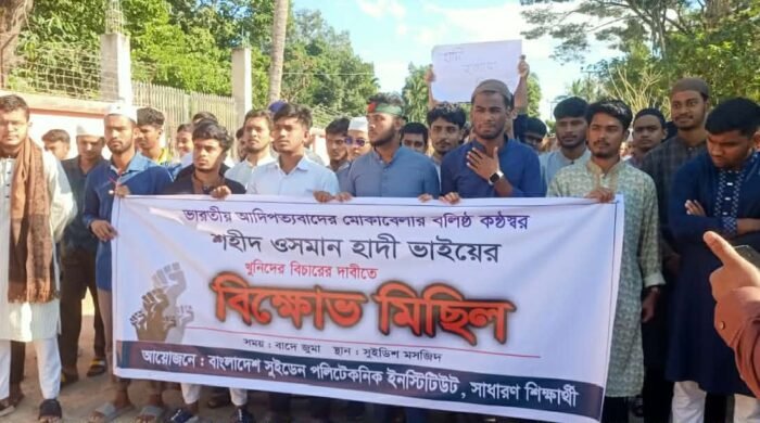 কাপ্তাই প্রতিনিধি। ইনকিলাবের মুখপাত্র শহীদ ওসমান হাদীর খুনিদের বিচারের দাবিতে কাপ্তাইয়ে বিক্ষোভ মিছিল করা হয়েছে। শুক্রবার বাদ জুমা কাপ্তাই বিএফআইডিসি শিল্প এলাকা বটতল হতে বাংলাদেশ সুইডেন পলিটেকনিক ইনস্টিটিউট এর সাধারণ